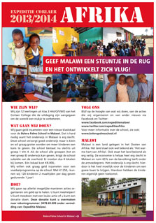 | Wij zijn 12 leerlingen uit klas 3 HAVO/VWO van het Corlaer College die de uitdaging zijn aangegaan om in april 2014 naar Malawi te gaan. Hier gaan wij samen met stichting Bolera Palms helpen om een klaslokaal bij te bouwen voor de Bolera Palms School. Wij gaan verschillende acties organiseren om aan het geld te komen om dit doel te behalen. Van deze acties en ander nieuws kunt u op de hoogte blijven via Facebook, Twitter en natuurlijk via deze site! | |||