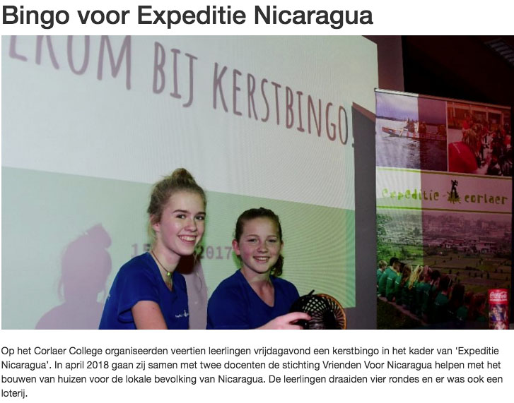 Eindelijk is het zo ver! We gaan met onze groep richting Nicaragua! Het hele jaar zijn wij druk bezig geweest om geld op te halen voor ons doel. Verschillende acties hebben wij gehouden om geld op te halen. Zo hebben we bijvoorbeeld een bingo georganiseerd om geld in te zamelen. Ook hebben we een aantal kantineverkopen gehad. We hebben zoveel mogelijk bedrijven gebeld, met de vraag of ze ons wilde sponsoren. Met het geld wat we hebben opgehaald kunnen we de mensen in Nicaragua helpen met een betere toekomst! We zijn blij dat we een stukje kunnen bijdragen aan hun leven.