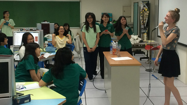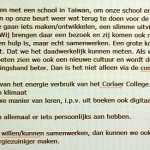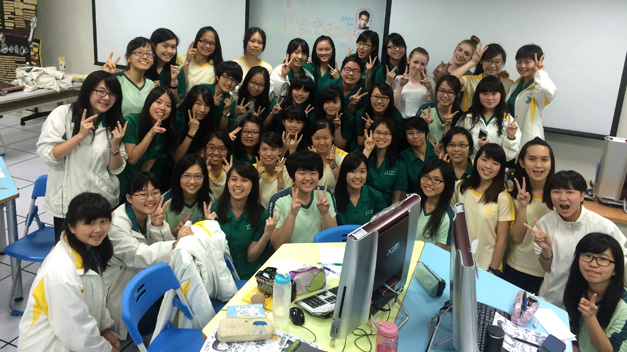 Ik vond het erg leuk om de leerlingen te ontmoeten en vond het erg leuk dat ze allemaal een Engelse naam hadden, zodat ik het kon onthouden. Ik vond het ook leuk dat ze allemaal vragen hadden en dat ze ons hebben uitgenodigd voor het Taiwanese carnaval dat ze één keer per jaar hebben.