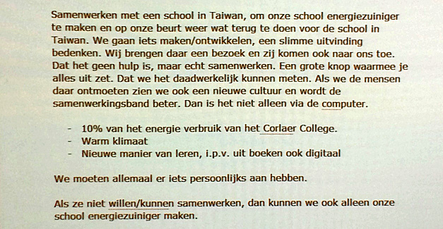 Hallo, wij zijn Expeditie World Wide Technologie. Wij gaan samenwerken met een school in Taiwan, dit willen wij doen om onze eigen school energiezuiniger te maken. Hiervoor willen wij graag samen met de leerlingen uit Taiwan en product ontwikkelen om onze school energiezuiniger te maken. In Taiwan zijn scholen al ver op weg om energieneutraal te worden, door aangescherpte wetgeving door de overheid. Vervolgens willen wij ook wat terug doen voor de school in Taiwan. We dachten aan een probleem bij hen op school die wij met onze kennis misschien kunnen verhelpen. We willen hierbij ons einddoel ook echt kunnen meten, zoals bijvoorbeeld het minder gebruiken van gas en/of electra. Zo kunnen we onze school energiezuiniger maken met bijvoorbeeld een uitvinding. …